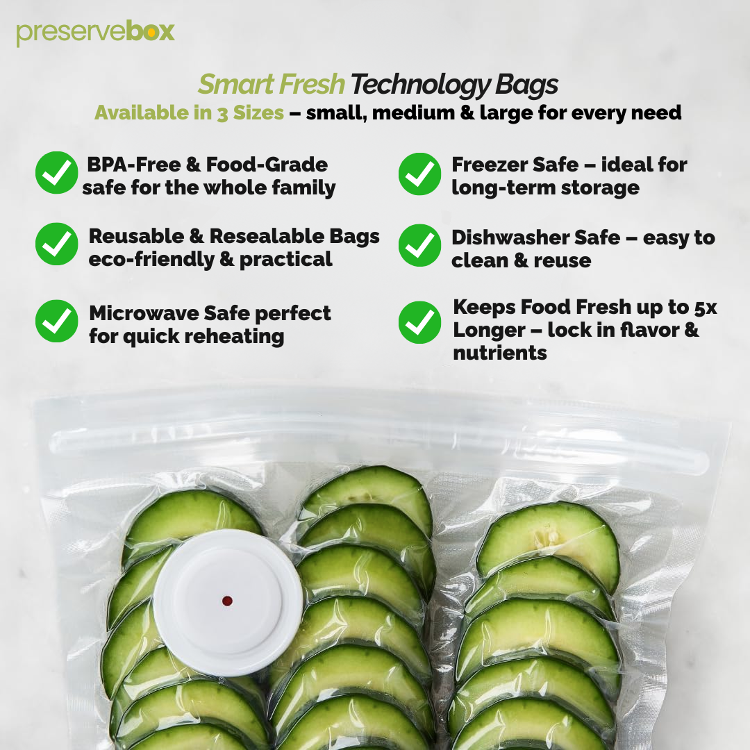 Our PreserveBox® Smart Fresh Bags are designed with innovative valve technology to keep your food fresh up to 5x longer.